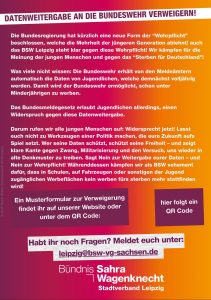 BSW Leipzig unterstützt den bundesweiten Schülerstreik am 5. Dezember. Dazu stellen wir ein Musterformular zum Download bereit, mit dem Schüler Widerspruch gegen die Übermittlung ihrer Daten an die Bundeswehr einlegen können.