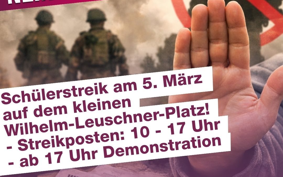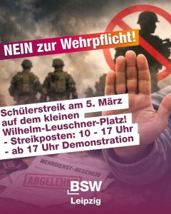 BSW Leipzig unterstützt den Schülerstreik gegen die Wehrpflicht! Kommt am 5. März auf den kleinen Wilhelm-Leuschner-Platz: Von 10 bis 17 Uhr befindet sich dort der Streikposten der streikenden Schüler – und ab 17 Uhr wird es eine Demonstration durch die Innenstadt geben.